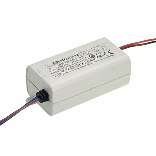Zasilacze impulsowe serii APV marki Mean Well to urządzenia w plastikowej obudowie ze stopniem ochrony IP30.